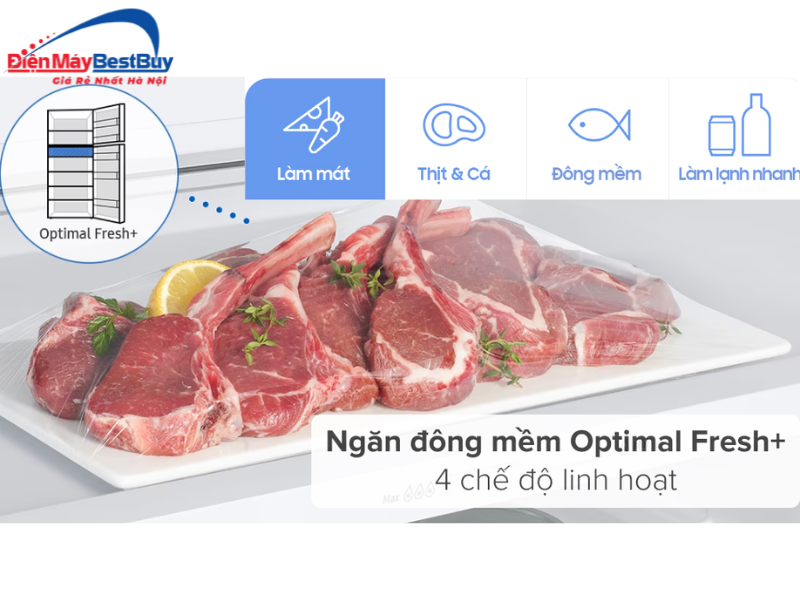 Điểm nổi bật khác là ngăn đông mềm Optimal Fresh+ cho phép bảo quản thịt cá không cần rã đông, rất tiện lợi cho người nội trợ.