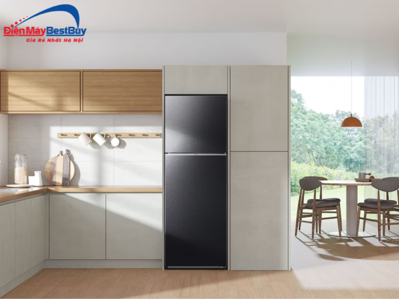 Đây là một trong những model bán chạy nhờ thiết kế sang trọng với gam màu đen hiện đại, phù hợp nhiều không gian bếp. Tủ có dung tích khoảng 348L, phù hợp gia đình 3–4 người.