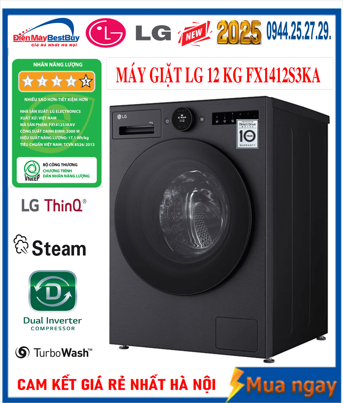 Máy giặt LG FX1413S3KA màu đen ra mắt 2025 Máy giặt cửa ngang 12kg – 1.400 vòng / phút Tự động phân bổ nước giặt, nước xả EzDispense Giặt nhanh 39 phút TurboWash360º tiết kiệm thời gian 14 chương trình giặt đáp ứng đa dạng nhu cầu giặt giũ Công nghệ AI DD inverter máy chạy êm, tiết kiệm điện Giặt hơi nước Steam diệt khuẩn hiệu quả Kết nối điều khiển máy giặt qua điện thoại thông minh Kích thước (C x R x S)mm: 850 x 600 x 615