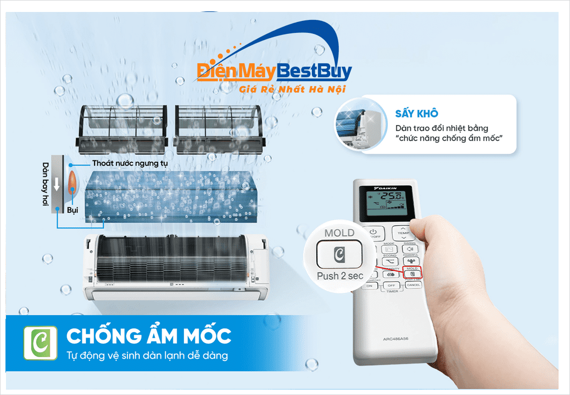 Điều hòa Daikin FTHB25ZVMV được trang bị chế độ chống ẩm mốc dàn lạnh (Mold-proof Operation) giúp ngăn chặn vi khuẩn và nấm mốc hình thành bên trong máy sau thời gian dài sử dụng. Khi tắt điều hòa, hệ thống sẽ tự động chạy quạt thêm vài phút để làm khô hoàn toàn dàn lạnh, từ đó: