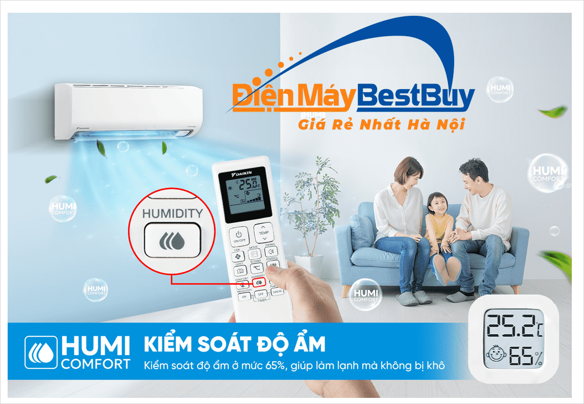 Điều hòa Daikin FTHB25ZVMV [2026] được trang bị chế độ Humi Comfort – công nghệ kiểm soát độ ẩm thông minh giúp căn phòng không chỉ mát mà còn dễ chịu hơn hẳn so với cách làm lạnh thông thường. Thay vì hạ nhiệt độ quá thấp gây khô da hoặc bí bách, Humi Comfort sẽ tự động điều chỉnh độ ẩm ở mức lý tưởng (khoảng 50–60%), mang lại: