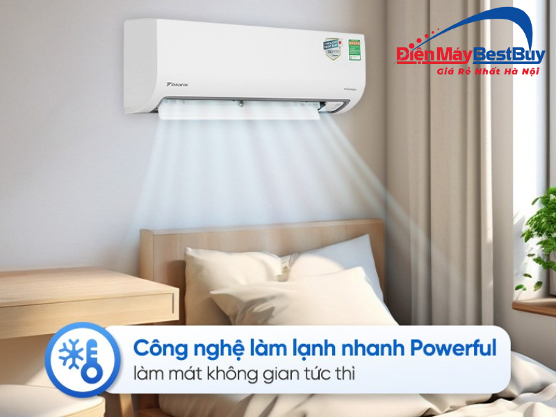 Trong những ngày nắng nóng cao điểm, chế độ làm lạnh nhanh Powerful trên điều hòa Daikin FTHB35ZVMV phát huy tối đa hiệu quả. Khi kích hoạt, máy sẽ tăng công suất hoạt động trong thời gian ngắn, giúp nhiệt độ phòng giảm nhanh chóng, mang lại cảm giác mát mẻ gần như tức thì.
