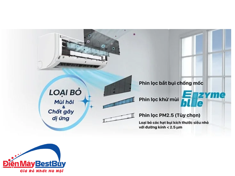 Điều hòa Daikin FTHB35ZVMV được trang bị phin lọc Enzyme Blue có khả năng khử mùi hiệu quả và hạn chế sự phát triển của vi khuẩn trong không khí. Phin lọc này giúp loại bỏ mùi hôi, mùi ẩm mốc và các tác nhân gây khó chịu, giữ cho không gian luôn thông thoáng và dễ chịu.