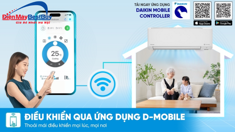 Điều hòa Daikin FTKY50ZVMV hỗ trợ điều khiển thông minh thông qua ứng dụng D-Mobile khi kết nối Wi-Fi. Người dùng có thể dễ dàng kiểm soát điều hòa bằng điện thoại, từ việc bật/tắt, điều chỉnh nhiệt độ đến lựa chọn chế độ hoạt động phù hợp.