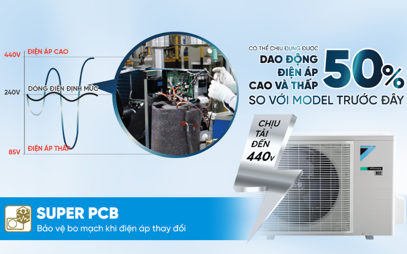 Thêm vào đó, model này được trang bị Super PCB có nhiệm vụ bảo vệ bo mạch khi điện áp thay đổi. Trong điều kiện nguồn điện không ổn định, Super PCB giúp hạn chế nguy cơ hỏng hóc linh kiện, đảm bảo điều hòa hoạt động ổn định và bền bỉ hơn theo thời gian.