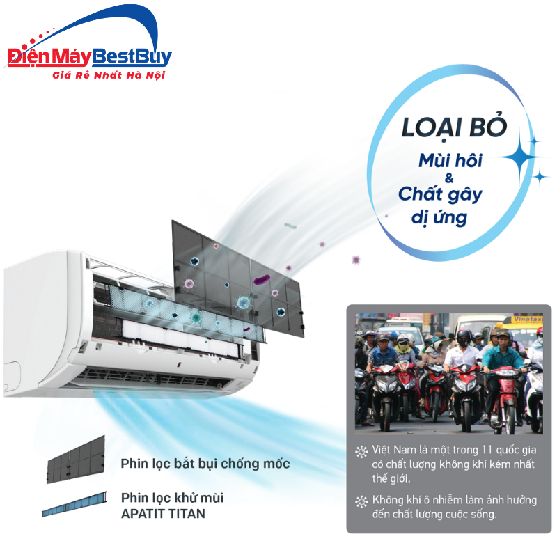 Điều hòa Daikin FTXV35QVMV được trang bị phin lọc Apatit Titan giúp cải thiện chất lượng không khí trong phòng. Phin lọc này có khả năng hấp thụ mùi hôi, giảm bụi bẩn và hỗ trợ ức chế sự phát triển của vi khuẩn tồn tại trong không khí. Nhờ đó, không khí trong phòng trở nên dễ chịu và trong lành hơn, góp phần bảo vệ sức khỏe cho người sử dụng.