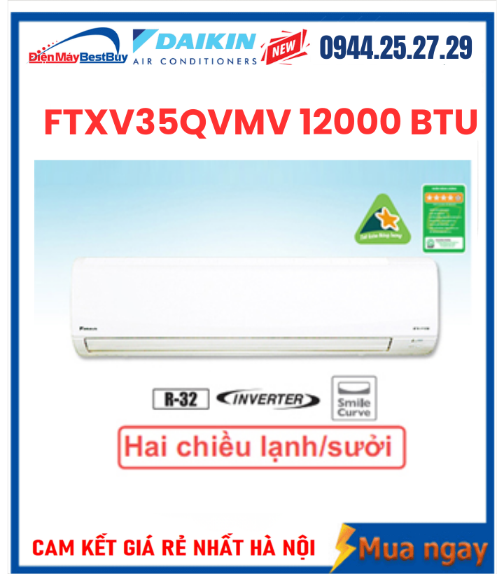 Điện máy BESTBUYS phân phối đa dạng các dòng điều hòa thương hiệu Daikin, trong đó có mẫu điều hòa Daikin FTXV35QVMV 12000BTU 2 chiều Inverter. Cam kết của BESTBUYS: sản phẩm chính hãng, giá rẻ nhất thị trường, bảo hành 12 tháng cho dàn lạnh và 48 tháng cho máy nén. Đội ngũ nhân viên tư vấn và đội ngũ kỹ thuật viên luôn sẵn sàng hỗ trợ khách hàng 24/7.
