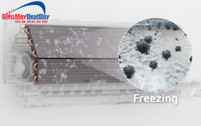 Khi kích hoạt, hệ thống sẽ làm lạnh sâu để tạo một lớp băng mỏng bao phủ bề mặt dàn lạnh. Sau đó, lớp băng này tan chảy, cuốn theo bụi bẩn và vi khuẩn bám trên bề mặt xuống khay thoát nước. Nhờ vậy, dàn lạnh được làm sạch mà người dùng không cần tháo lắp phức tạp.