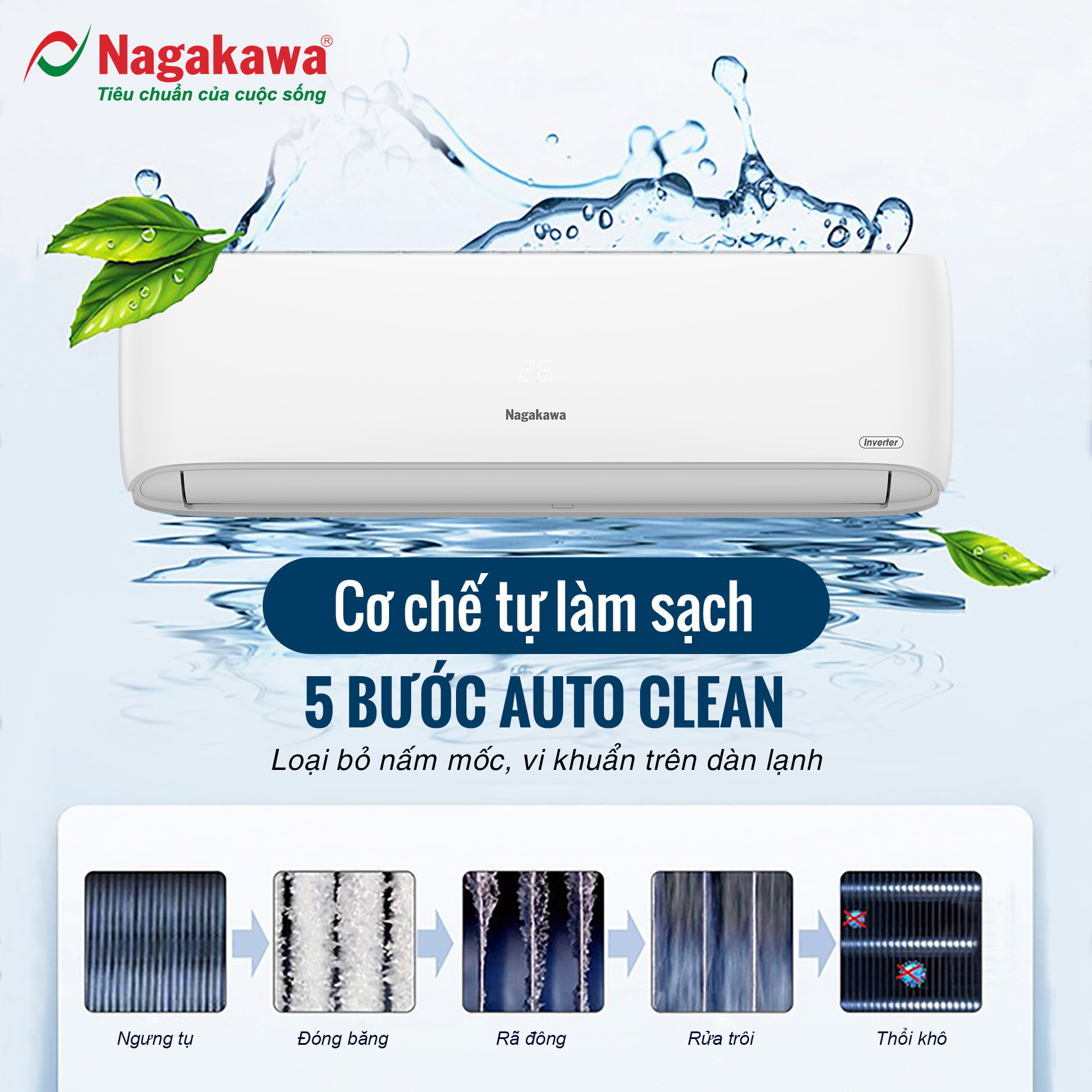 Khi khởi động chức năng AutoClean, máy sẽ tự động làm lạnh và đóng băng bề mặt dàn lạnh. Sau đó, máy kích sẽ làm tan băng cuốn trôi vi khuẩn và quạt gió tiếp tục thổi khô để giúp loại bỏ bụi bẩn bề mặt dàn đồng thời tăng tuổi chọ và tăng hiệu quả làm lạnh của máy