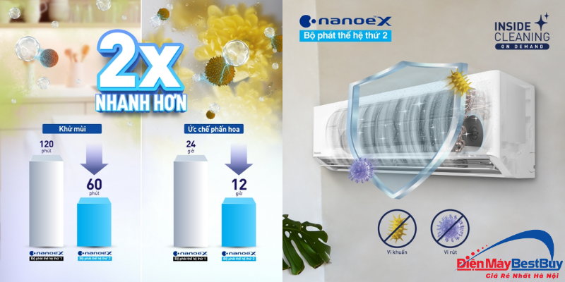 Công nghệ nanoe™ X thế hệ 2 tạo ra lượng lớn các gốc hydroxyl bọc trong nước với mật độ cao hơn, giúp tăng hiệu quả ức chế vi khuẩn, virus, nấm mốc và các tác nhân gây mùi.