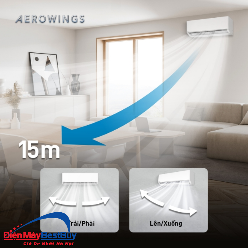 Hệ thống cánh đảo gió Aerowings với thiết kế cánh kép độc đáo giúp luồng gió thổi xa tới 15 mét, phân bổ đều khắp phòng và hạn chế gió lạnh thổi trực tiếp vào người. Người dùng sẽ cảm nhận được sự mát mẻ lan tỏa nhẹ nhàng, không bị cảm giác lạnh buốt.