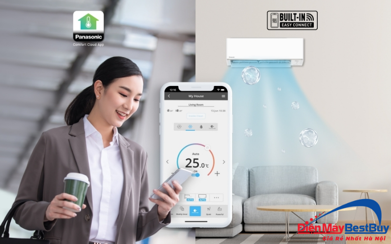 Điều hòa Panasonic RU12CKH hỗ trợ kết nối WiFi, cho phép người dùng điều khiển điều hòa thông qua ứng dụng trên điện thoại thông minh. Bạn có thể bật tắt máy, thay đổi nhiệt độ, chọn chế độ làm lạnh hoặc hẹn giờ ngay cả khi không có mặt tại nhà.