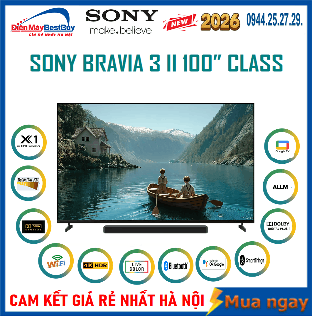 Sở hữu Google Tivi Sony BRAVIA 3 AI 4K 100 inch K-100XR30M2 chính là sự đầu tư xứng đáng để kiến tạo không gian giải trí đỉnh cao ngay tại gia. Hãy đến ngay hệ thống Điện máy Bestbuy để trực tiếp chiêm ngưỡng tuyệt tác công nghệ này và nhận về những ưu đãi mua sắm độc quyền tốt nhất.
