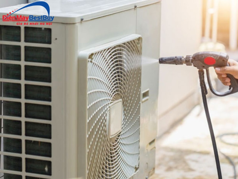 + Dàn nóng thường đặt ngoài trời nên dễ bị bám bụi, lá cây hoặc côn trùng. Bạn dùng vòi nước xịt nhẹ vào các khe tản nhiệt để làm sạch.