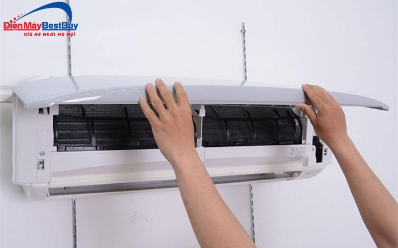 + Mở nắp trước của điều hòa bằng cách kéo nhẹ lên. Bên trong sẽ là tấm lưới lọc, nơi giữ lại phần lớn bụi bẩn từ không khí.