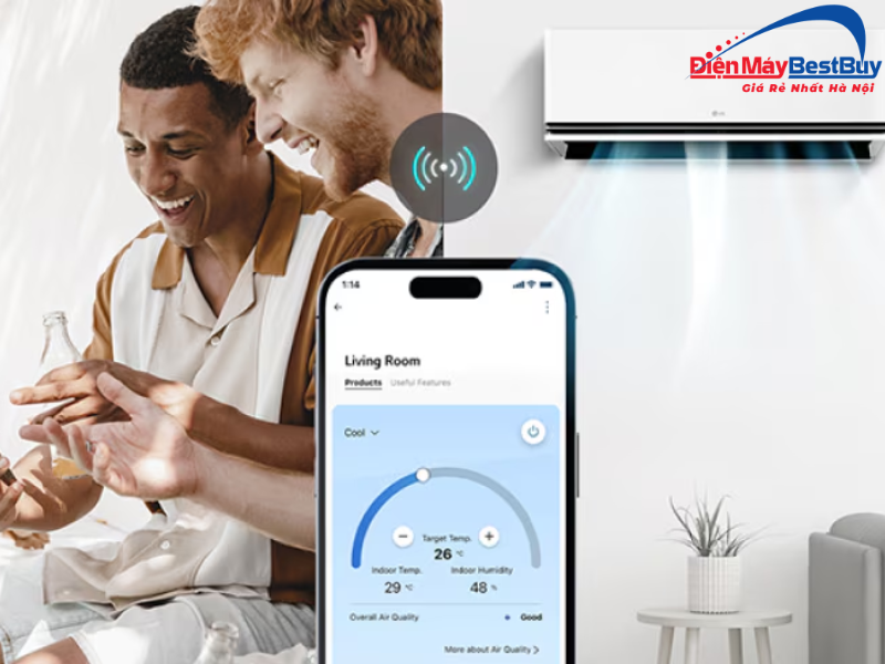 - Kết nối wifi cho phép người dùng điều khiển điều hòa ở bất cứ đâu thông qua ứng dụng LG ThinQ trên điện thoại thông minh. Bạn có thể bật điều hòa trước khi về nhà, kiểm tra trạng thái hoạt động hoặc điều chỉnh các chế độ ngay cả khi không ở trong phòng.