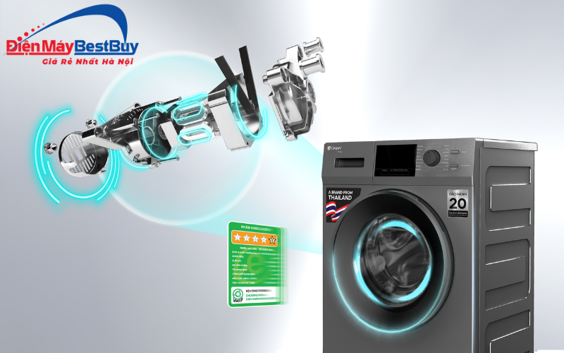- Động cơ inverter BLDC: vận hành êm ái, giảm rung lắc và tiết kiệm điện năng. Động cơ này có độ bền cao, ít hao mòn, phù hợp với nhu cầu sử dụng lâu dài của gia đình. Khi giặt hoặc vắt ở tốc độ cao, máy vẫn hoạt động ổn định, hạn chế tiếng ồn.