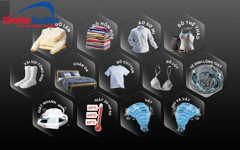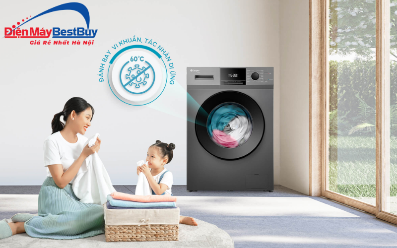 - Giặt nước nóng lên đến 95°C: Nhiệt độ cao giúp tăng hiệu quả làm sạch các vết bẩn cứng đầu, đồng thời hỗ trợ loại bỏ vi khuẩn và tác nhân gây mùi. Tính năng này đặc biệt hữu ích khi giặt đồ trẻ em, khăn tắm hoặc quần áo cần vệ sinh kỹ.