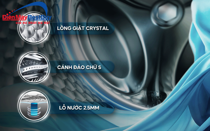 - Cánh đảo chữ S kết hợp lồng giặt Crystal: Cánh đảo chữ S cùng lồng giặt Crystal tạo chuyển động giặt mạnh mẽ nhưng vẫn êm ái, giúp quần áo được đảo đều, tiếp xúc tốt với nước và bột giặt. Bề mặt lồng giặt Crystal có các lỗ thoát nước nhỏ, hạn chế tình trạng sờn rách sợi vải, bảo vệ quần áo tốt hơn sau nhiều lần giặt.