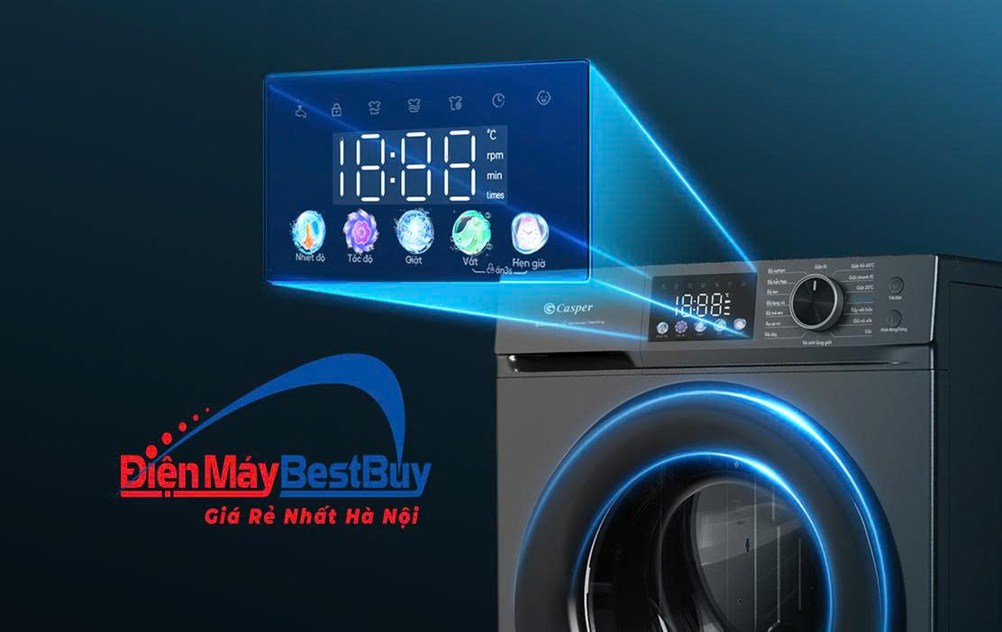 - Bảng điều khiển đa sắc màu hiện đại với giao diện trực quan, hiển thị rõ ràng các chương trình giặt và thông tin cần thiết. Các biểu tượng được thiết kế dễ hiểu, kết hợp cùng núm xoay và phím cảm ứng nhạy, giúp người dùng thao tác nhanh chóng và chính xác.