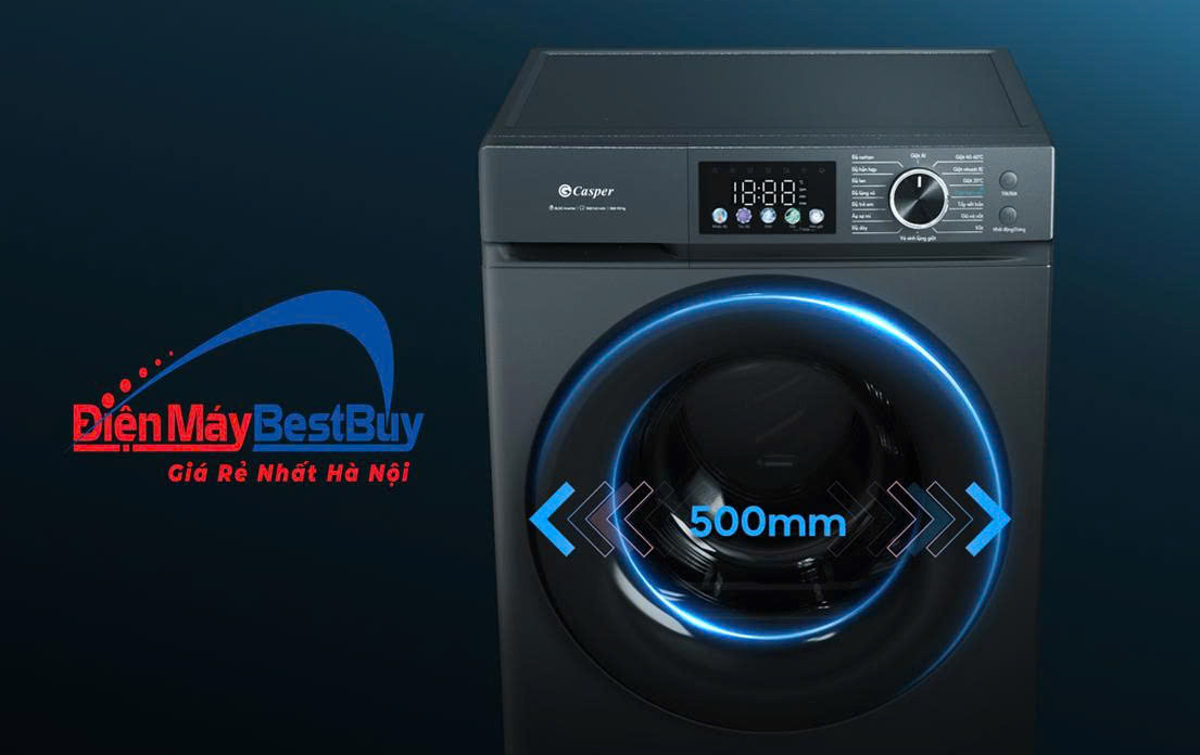 - Cửa lồng giặt có đường kính lên đến 500mm. Thiết kế này giúp việc cho quần áo vào và lấy ra trở nên dễ dàng hơn, đặc biệt với các loại đồ cồng kềnh như chăn, mền hay áo khoác dày.