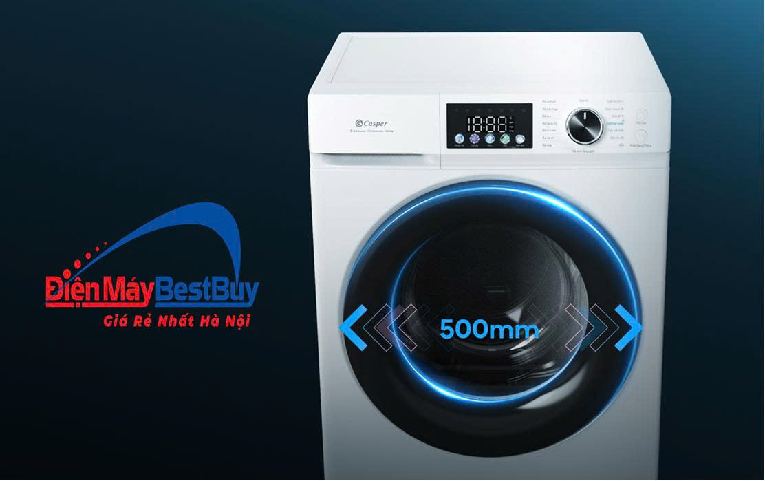 - Cửa lồng giặt có đường kính lớn lên đến 500mm. Thiết kế này giúp việc cho đồ vào và lấy đồ ra thuận tiện hơn, đặc biệt khi giặt chăn mền, áo khoác dày hoặc quần áo số lượng lớn.