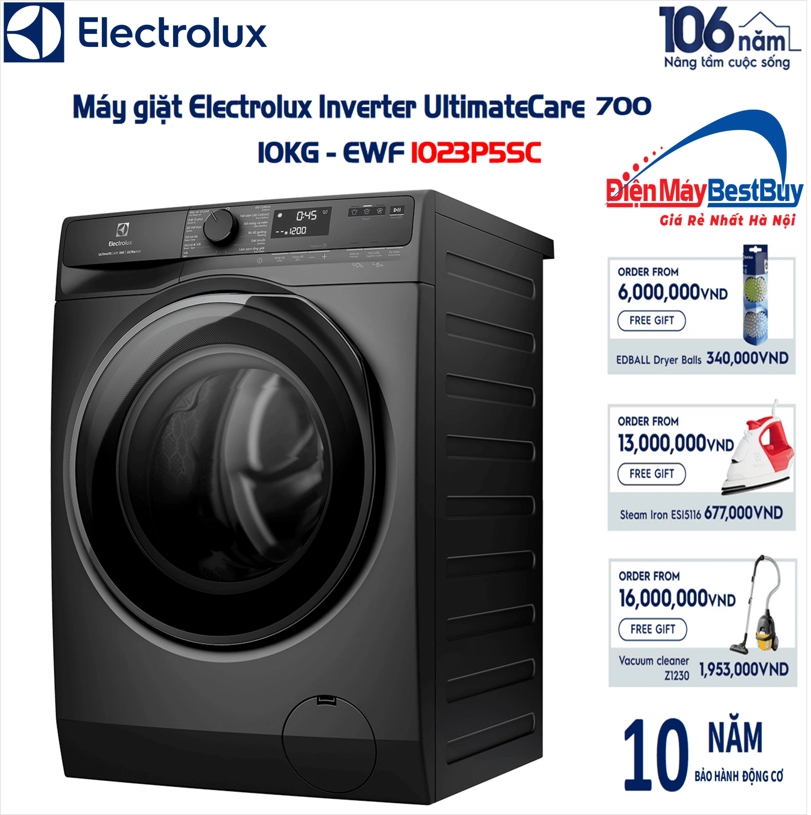 Máy giặt Electrolux EWF1023P5SC UltimateCare 500 Inverter 10kg là trợ thủ đắc lực giúp người dùng nhẹ bớt gánh nặng việc nhà. Sở hữu nhiều tính năng ưu việt, chiếc máy giặt cửa ngang này không chỉ giúp bạn tiết kiệm thời gian, công sức mà còn nâng niu bảo vệ quần áo một cách tốt hơn. Để khám phá chi tiết những ưu điểm nổi bật của máy giặt Electrolux EWF1023P5SC, bạn hãy theo dõi bài viết dưới đây.