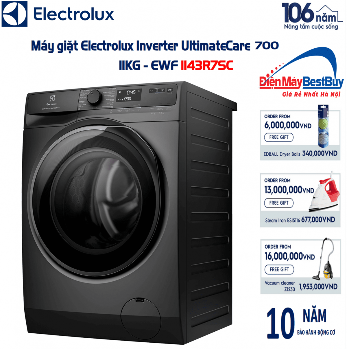 Máy giặt Electrolux EWF1143R7SC Inverter 11 kg là sản phẩm cao cấp, mang đến giải pháp giặt giũ hiệu quả, tiết kiệm cho gia đình. Với thiết kế hiện đại, tính năng vượt trội cùng công nghệ tiên tiến, sản phẩm này xứng đáng là lựa chọn lý tưởng cho những gia đình có nhu cầu giặt giũ hàng ngày. Máy giặt Electrolux EWF1143R7SC không chỉ giúp bảo vệ sức khỏe mà còn tiết kiệm chi phí điện năng. Dưới đây là những đặc điểm nổi bật của sản phẩm này.