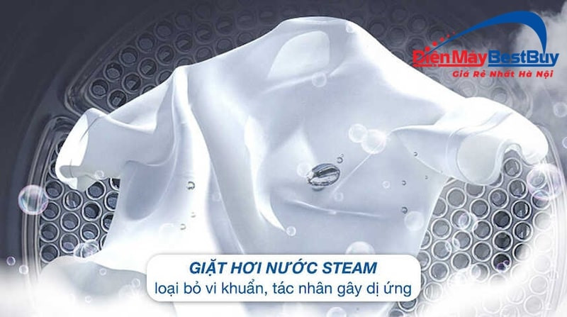 Công nghệ giặt hơi nước Steam sử dụng hơi nước nóng thẩm thấu sâu vào sợi vải, mang lại hiệu quả kép vượt trội. Hơi nước giúp làm mềm sợi vải, giảm thiểu đáng kể các nếp nhăn, qua đó tiết kiệm thời gian là ủi cho người dùng. Quan trọng hơn, công nghệ này còn có khả năng tiêu diệt tới 99,9% các tác nhân gây dị ứng và vi khuẩn, bảo vệ sức khỏe cho làn da nhạy cảm.