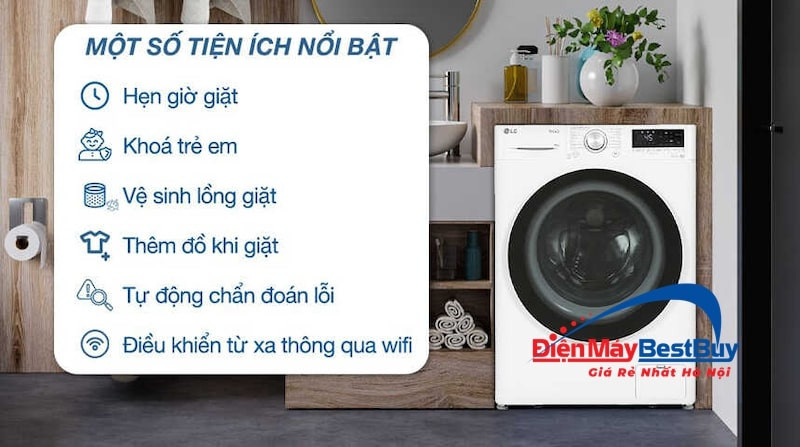 Các tính năng an toàn như Khóa trẻ em là một tiện ích cần thiết, giúp vô hiệu hóa bảng điều khiển để tránh trẻ nhỏ nghịch ngợm gây ảnh hưởng đến chu trình giặt. Ngoài ra, tính năng Hẹn giờ giặt cho phép người dùng chủ động cài đặt thời gian kết thúc chu trình, giúp quần áo được giặt xong vào đúng thời điểm mong muốn, tránh tình trạng ẩm mốc do để lâu trong lồng giặt.
