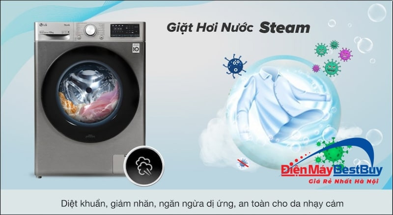 Công nghệ giặt hơi nước Steam là một tính năng không thể thiếu trên các dòng máy cửa trước cao cấp của LG. Hơi nước nóng siêu nhỏ được phun thẩm thấu sâu, giúp làm mềm sợi vải và giảm thiểu nếp nhăn một cách hiệu quả. Đồng thời, công nghệ này còn có tác dụng loại bỏ các tác nhân gây dị ứng và vi khuẩn, mang lại quần áo sạch sẽ tuyệt đối, an toàn cho da nhạy cảm.