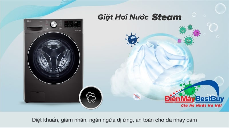 LG đã tích hợp công nghệ giặt hơi nước Steam vào máy FX1412N5G, cho phép hơi nước nóng thẩm thấu sâu vào quần áo trong quá trình giặt. Công nghệ hơi nước này có khả năng loại bỏ hiệu quả các tác nhân gây dị ứng, vi khuẩn và bụi bẩn, đảm bảo quần áo luôn sạch khuẩn. Đây là giải pháp lý tưởng để bảo vệ sức khỏe, đặc biệt phù hợp với gia đình có da nhạy cảm.