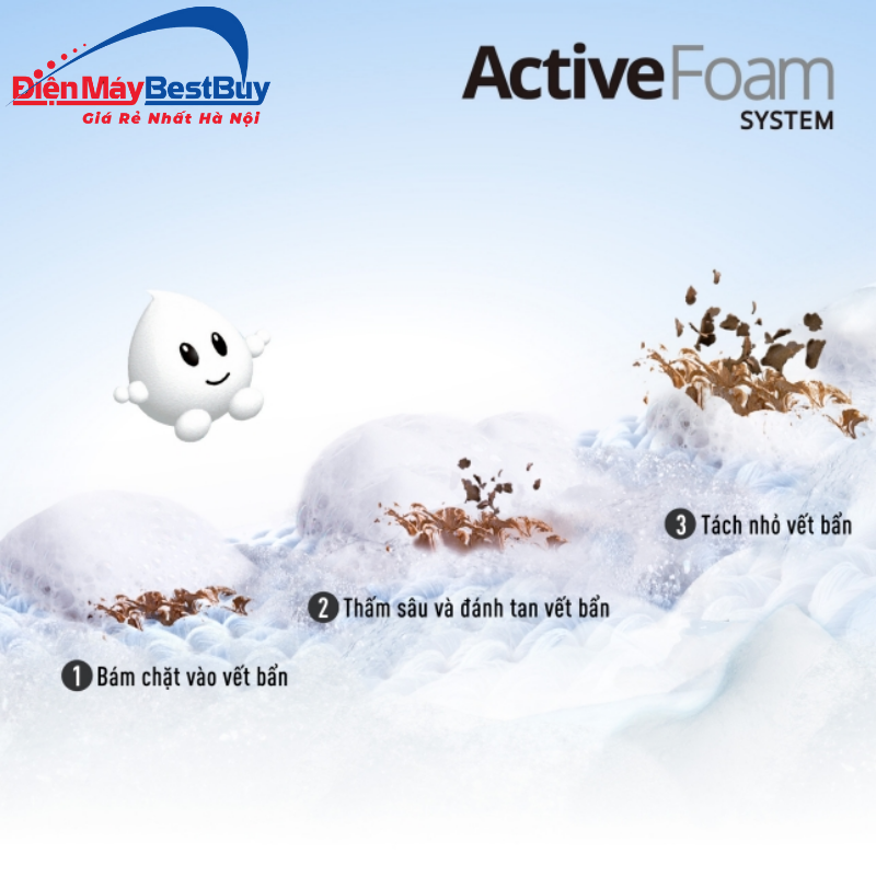 Hệ thống ActiveFoam có khả năng hòa tan bột giặt/nước giặt thành lớp bọt siêu mịn trước khi đưa vào lồng giặt. Nhờ bọt mịn thấm nhanh và đều, chất giặt tẩy dễ dàng len lỏi vào từng sợi vải, giúp đánh bật vết bẩn hiệu quả hơn so với việc cho trực tiếp bột giặt vào lồng. Quần áo được giặt sạch hơn, hạn chế cặn bột giặt bám lại sau khi giặt, đồng thời giảm tình trạng kích ứng da, đặc biệt với trẻ nhỏ.
