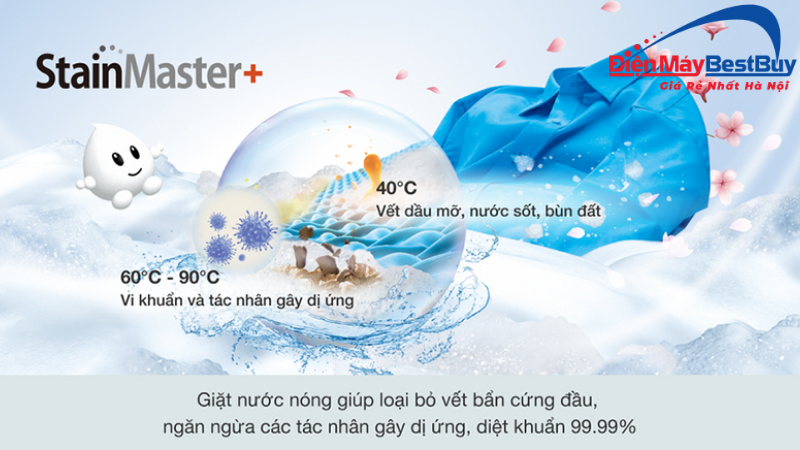 StainMaster+ hỗ trợ loại bỏ các vết bẩn khó giặt như mồ hôi, dầu mỡ hay bùn đất. Công nghệ này sử dụng nước nóng kết hợp hơi nước để tăng hiệu quả làm sạch. Ngoài khả năng đánh bay vết bẩn, StainMaster+ còn góp phần giảm vi khuẩn bám trên quần áo, giúp đồ giặt sạch hơn và an toàn hơn cho làn da, nhất là với trẻ nhỏ.