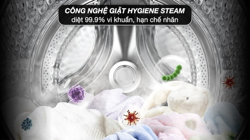 Một trong những điểm nhấn của chiếc máy giặt Samsung 10kg chính là công nghệ giặt hơi nước diệt khuẩn Hygiene Steam. Công nghệ này kích hoạt hơi nước ở nhiệt độ cao, từ đó loại bỏ cặn bẩn bám sâu và diệt đến 99.9% vi khuẩn, các tác nhân gây dị ứng, hỗ trợ bảo vệ sức khỏe gia đình.