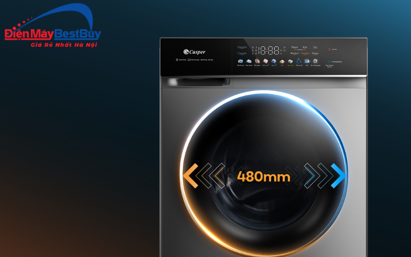 - Cửa lồng giặt lớn 480mm giúp việc cho đồ vào và lấy đồ ra trở nên dễ dàng hơn. Người dùng có thể thoải mái giặt các loại chăn mền, áo khoác dày hay quần áo kích thước lớn mà không gặp khó khăn. Cửa kính chịu lực chắc chắn, đóng mở êm ái, đồng thời tăng tính thẩm mỹ cho tổng thể thiết kế của máy.