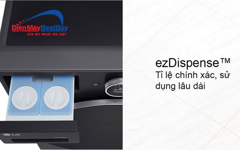 ezDispense là công nghệ độc quyền của LG, cho phép hệ thống tự động phân bổ nước giặt và nước xả theo từng mẻ giặt. Người dùng chỉ cần đổ đầy nước giặt/xả vào các ngăn chứa, máy sẽ tự động tính toán lượng nước giặt xả phù hợp cho 31 lần giặt giũ sau đó. Tính năng thông minh này không chỉ giúp tiết kiệm thời gian mà còn tránh lãng phí nước giặt/xả.