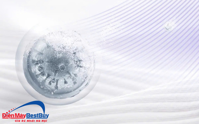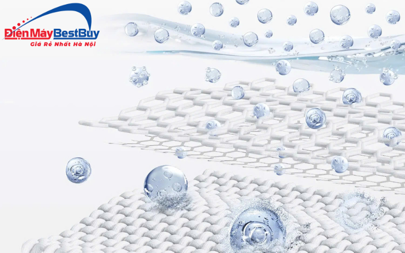 Công nghệ UFB (Ultra Fine Bubble) tạo ra hàng tỷ bọt khí nano siêu nhỏ, kích thước chỉ bằng phần nghìn bọt khí thông thường. Chúng len sâu vào sợi vải, phá vỡ liên kết của vết bẩn dầu mỡ, mồ hôi và chất bẩn khó tan.