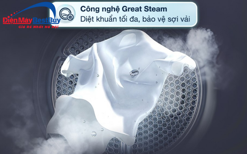 Great Steam sử dụng hơi nước nhiệt độ cao để loại bỏ vi khuẩn, mùi hôi và tác nhân gây dị ứng thường bám trên quần áo. Khi hơi nước được bơm vào lồng giặt, nhiệt độ tăng lên và tác động đều lên từng sợi vải. Qua đó làm sạch hiệu quả mà không phải giặt lại bằng tay hoặc dùng chất tẩy mạnh.