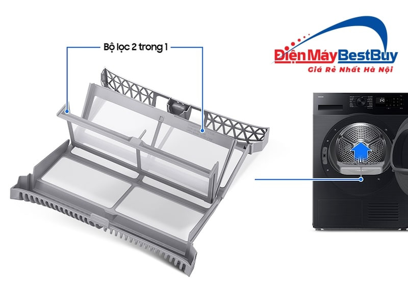 Thiết kế bộ lọc xơ vải 2 trong 1 tiên tiến trên chiếc máy sấy Samsung DV90CGC2A0ABSV 2 màng lọc thép, giúp lọc sạch xơ vải và bụi bẩn. Hệ thống đèn báo kép thông minh sẽ tự động nhắc nhở người dùng khi cần vệ sinh bộ lọc và bộ trao đổi nhiệt, đảm bảo hiệu suất sấy luôn tối ưu.