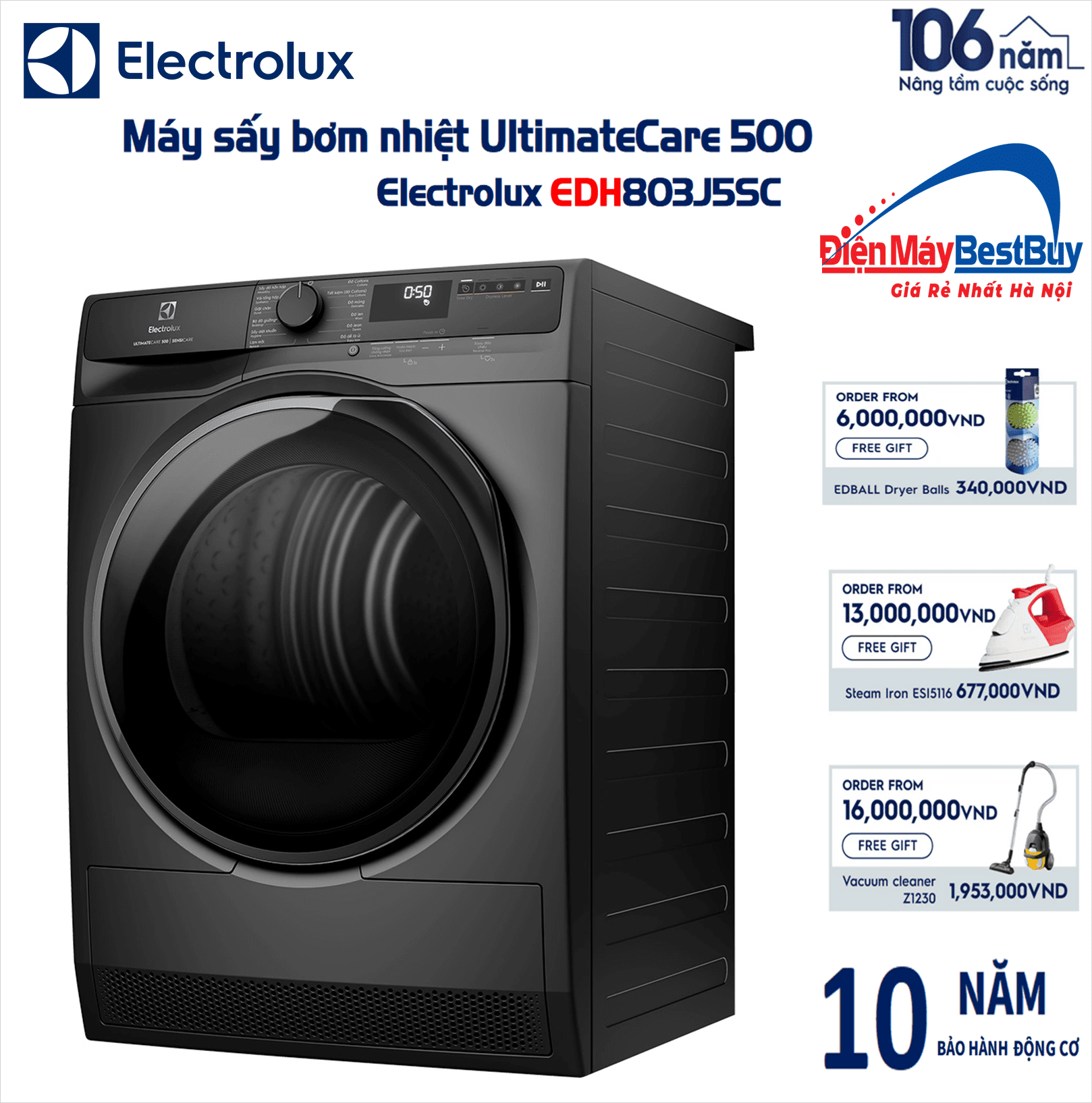 Máy sấy Electrolux EDH803J5SC là dòng máy sấy hiện đại được trang bị nhiều công nghệ tiên tiến, giúp bảo vệ quần áo và tiết kiệm điện năng. Với khối lượng sấy 8kg, máy phù hợp với nhu cầu của các gia đình có từ 3-5 thành viên. Được tích hợp công nghệ bơm nhiệt (Heat Pump), máy giúp giảm tiêu thụ điện năng nhưng vẫn đảm bảo khả năng sấy khô nhanh chóng và hiệu quả.