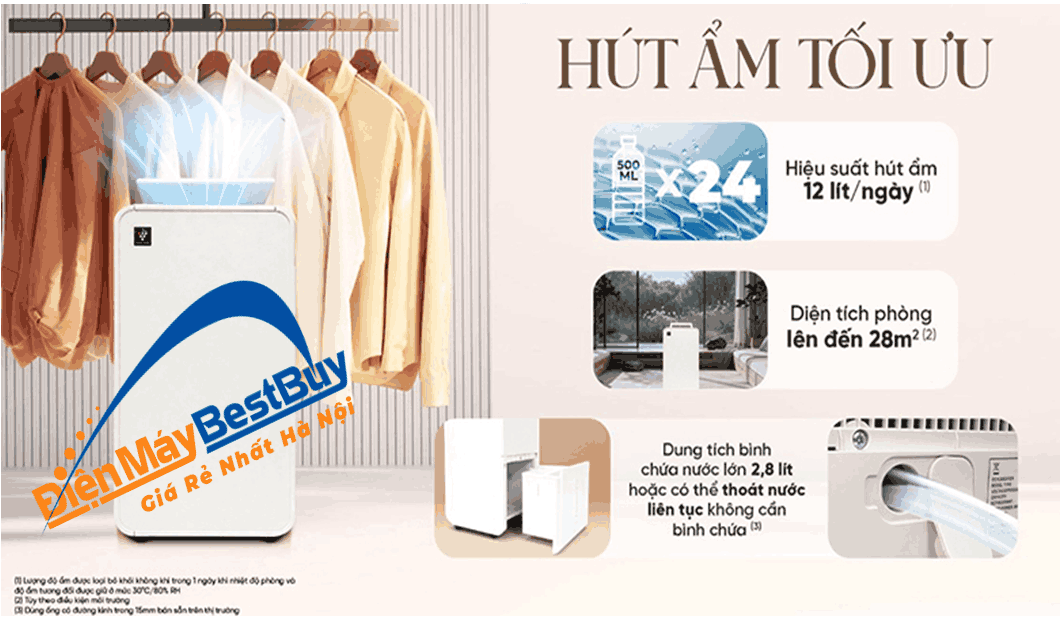 Máy hút ẩm Sharp DW-P12HV-W có khả năng hút ẩm lên tới 12 lít/ngày, lý tưởng cho: