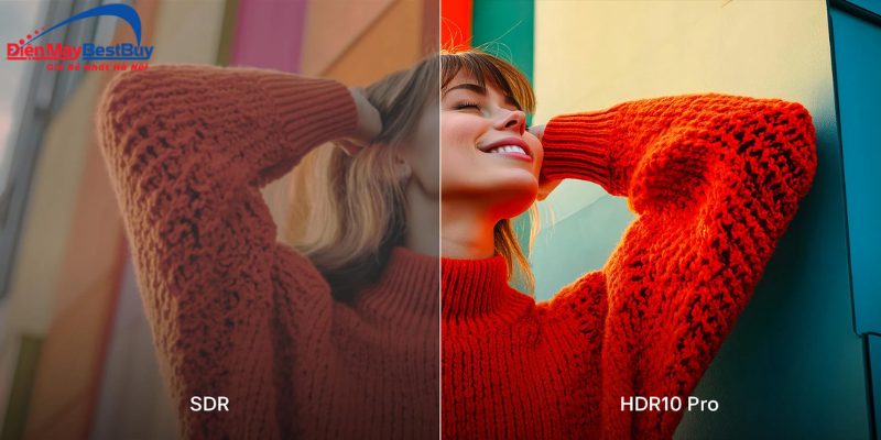 - Công nghệ HDR10 Pro giúp tăng cường độ sáng, cải thiện vùng sáng tối và làm nổi bật các chi tiết ở những cảnh có độ tương phản cao. Dù xem phim hành động, chương trình giải trí hay các thước phim phong cảnh, người dùng vẫn cảm nhận được độ sâu và sự chân thực trong từng khung hình.