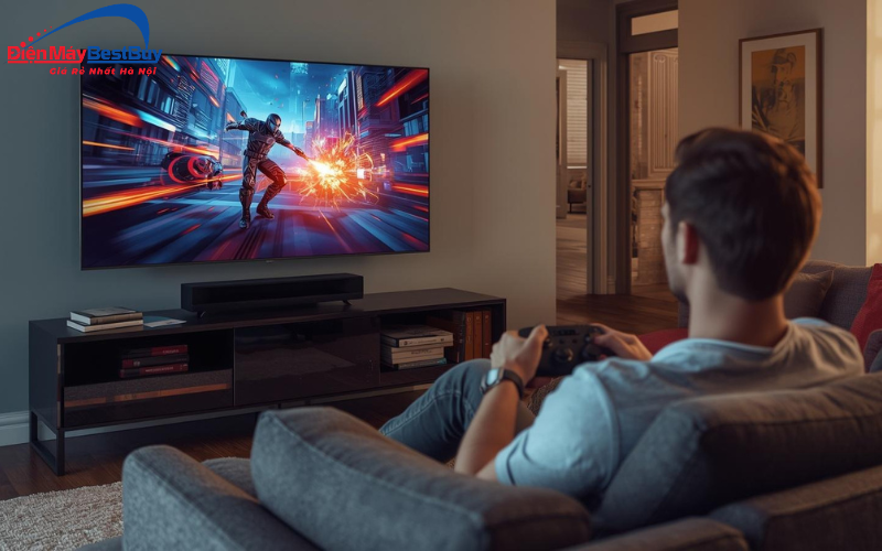 Về âm thanh, sản phẩm được trang bị công nghệ Dolby Atmos mang lại hiệu ứng âm thanh vòm sống động, giúp người dùng cảm nhận âm thanh chân thực hơn. AI Sound Pro tự động điều chỉnh âm thanh theo nội dung, trong khi Clear Voice Pro giúp tăng cường độ rõ của giọng nói, đặc biệt hữu ích khi xem tin tức hoặc phim có nhiều hội thoại. Ngoài ra, AI Acoustic Tuning còn giúp tối ưu âm thanh theo không gian phòng, mang lại trải nghiệm nghe tốt hơn.