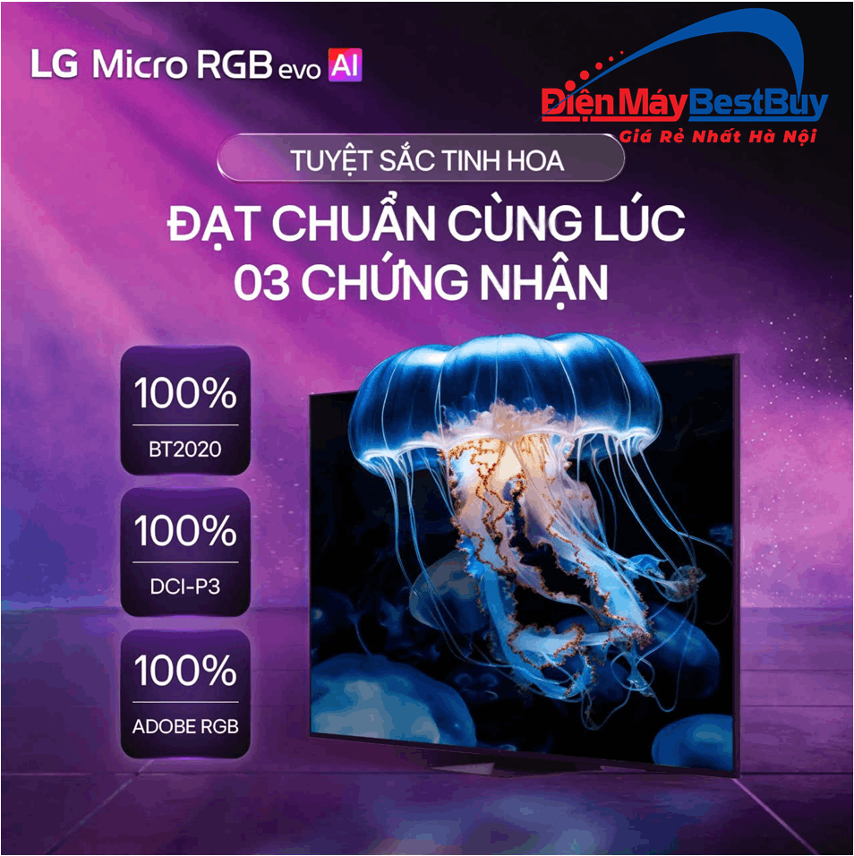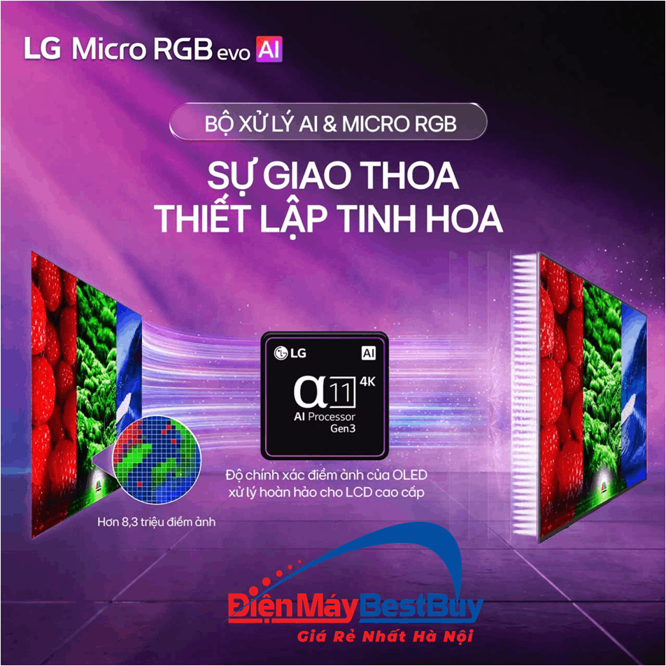 Smart Tivi LG Micro RGB evo AI 4K 86 inch 86MRGB86BSA Mới 2026 là mẫu tivi cao cấp hội tụ công nghệ hiển thị tiên tiến cùng trí tuệ nhân tạo mạnh mẽ. Với kích thước 86 inch cùng hệ thống xử lý hình ảnh hiện đại, sản phẩm mang đến trải nghiệm giải trí sống động, phù hợp cho không gian phòng khách lớn hoặc phòng chiếu phim tại gia.