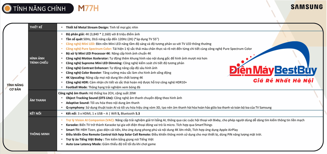 Thông số kỹ thuật Smart Tivi MiniLED Samsung Vision AI 4K 43 inch UA43M77HAKXXV