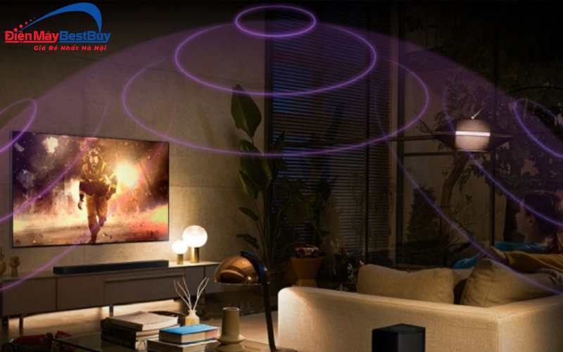 Về âm thanh, sản phẩm được trang bị công nghệ Object Tracking Sound, cho phép âm thanh di chuyển theo hình ảnh trên màn hình, tạo hiệu ứng chân thực như đang diễn ra trước mắt. Công nghệ Dolby Atmos mang đến âm thanh vòm đa chiều, giúp không gian giải trí trở nên sống động hơn.