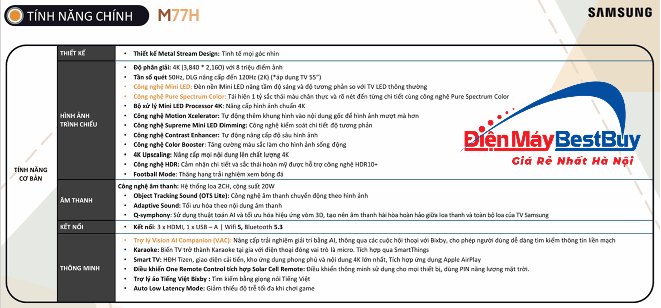 Thông số kỹ thuật Smart Tivi MiniLED Samsung Vision AI 4K 65 inch UA65M77HAKXXV