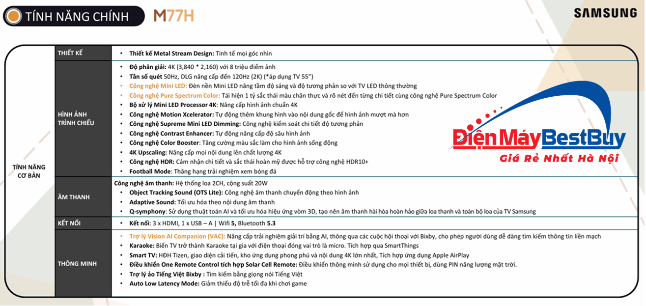 Thông số kỹ thuật Smart Tivi MiniLED Samsung Vision AI 4K 75 inch UA75M77HAKXXV