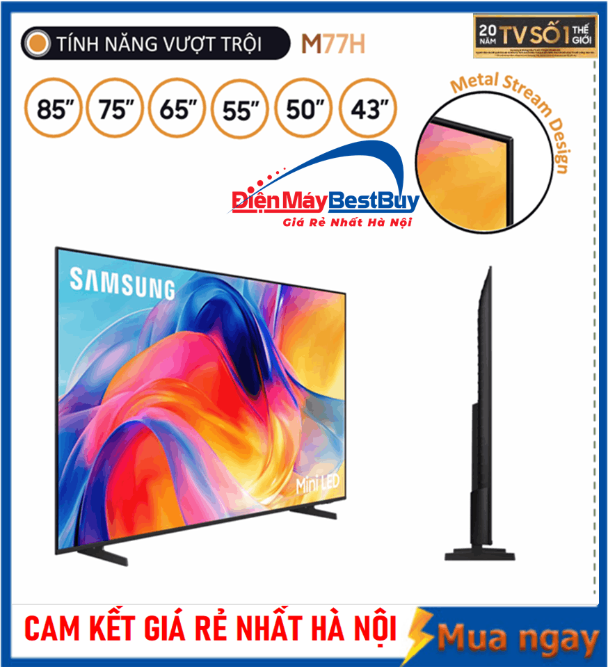 Smart Tivi Samsung MiniLED 4K 75 inch UA75M77H Mới 2026 là mẫu tivi màn hình lớn cao cấp, tích hợp công nghệ Mini LED hiện đại cùng hệ thống âm thanh tiên tiến. Với kích thước 75 inch ấn tượng, sản phẩm mang đến trải nghiệm giải trí đẳng cấp, phù hợp cho phòng khách rộng hoặc không gian xem phim tại gia.